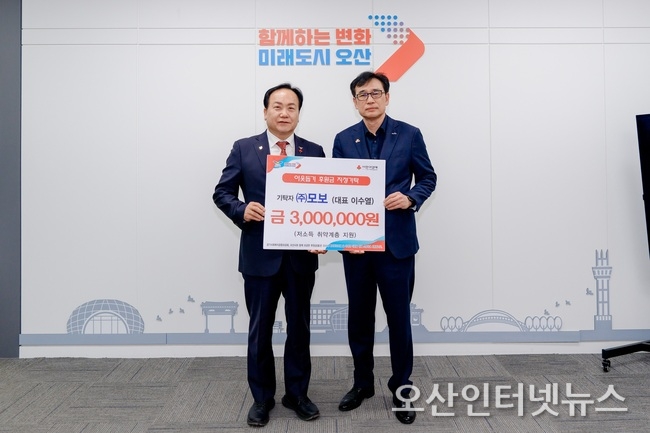 【오산인터넷뉴스】오산시는 지난 16일 ㈜모보(대표이사 이수열)로부터 지역 내 저소득 취약계층 지원을 위한 후원금 300만 원을 기탁받았다고 밝혔다.