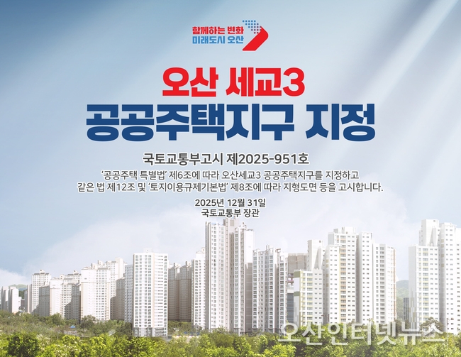 【오산인터넷뉴스】 오산시는 31일 국토교통부가 오산 세교3 공공주택지구(이하 오산세교3신도시)의 지구지정 고시를 완료했다고 밝혔다. 경제자족형 미래도시를 향한 청신호가 켜진 셈이다.