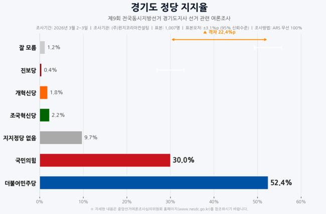 여론조사기관 윈지코리아컨설팅이 지난 3월 2일부터 3일까지 경기도 거주 만 18세 이상 1,007명을 대상으로 실시한 조사 결과 정당 지지도는 더불어민주당 52.4%, 국민의힘 30.0%로 집계됐다.