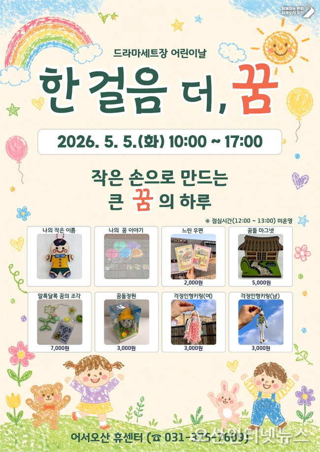【오산인터넷뉴스】오산시는 오는 5월 5일 어린이날을 맞아 오산 드라마세트장 일원에서 어린이와 가족이 함께 즐길 수 있는 체험 프로그램 ‘한 걸음 더, 꿈’을 운영한다고 밝혔다.