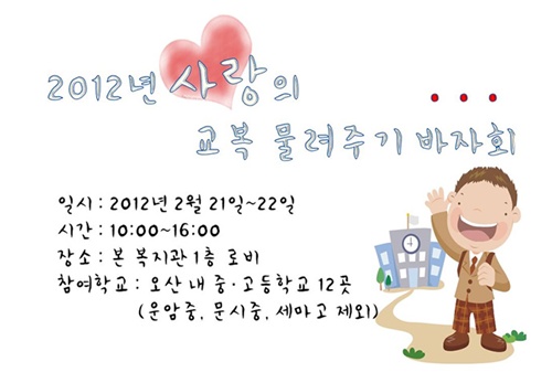 사랑의 교복 물려주기 바자회는 오산 지역 학부모들의 교복 구입비용의 부담을 덜어 주고 자원 재활용을 통해 환경을 보호한다는 취지로 2010년부터 시작했다.