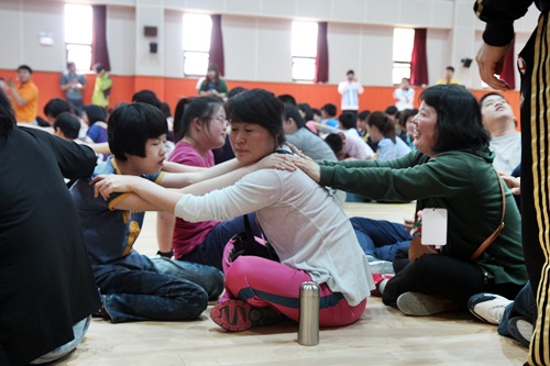 | ▲ 학생과 학부모가 서로 어깨를 안마하고 있다. |