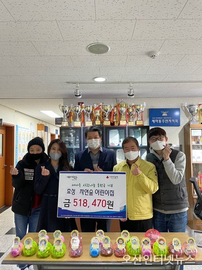 【오산인터넷뉴스】오산시 세마동행정복지센터은 지난 29일 양산동 소재 효성 자연숲어린이집(원장 양승연)에서는 원아 18명과 보육교사가 돼지저금통에 따뜻한 마음을 담아 후원금 518,470원을 세마동에 기탁했다고 밝혔다.
