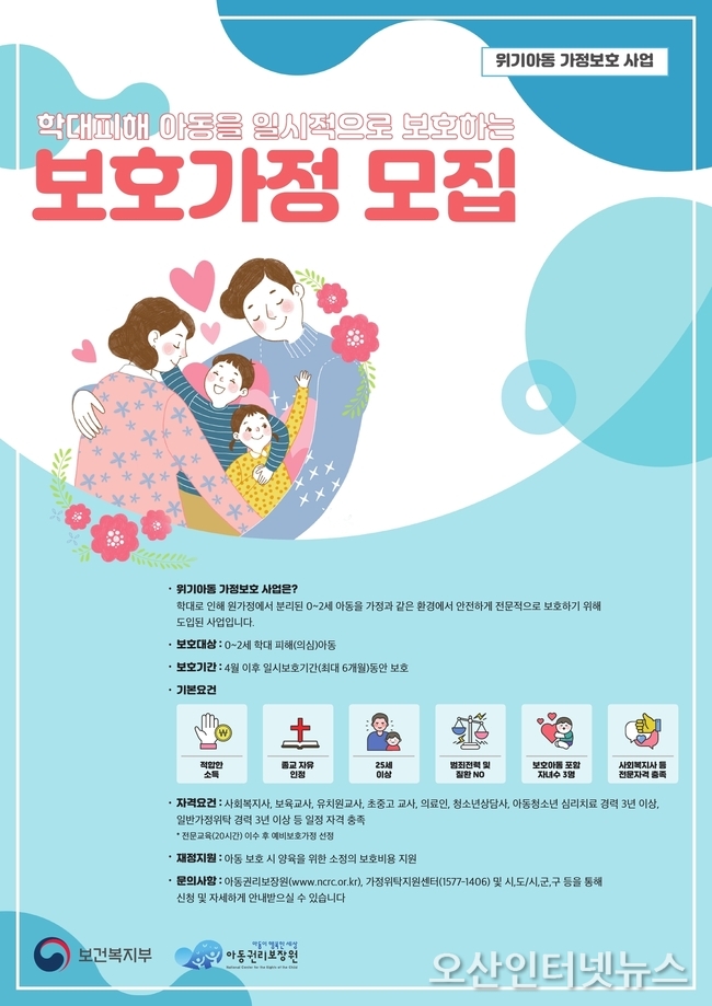 위기아동 보호가정은 연중 상시 모집하며, 아동권리보장원 홈페이지(www.ncrc.or.kr) 또는 경기남부가정위탁지원센터(☎031-234-3980)로 신청하면 된다.