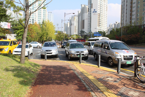 학생들은 어렵게 학원차량들 사이를 빠져 나가고 있다.