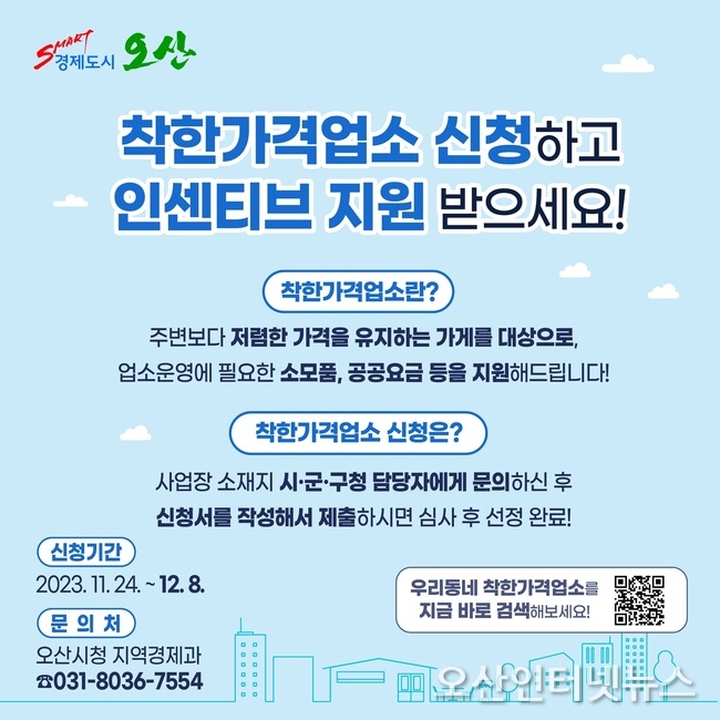 이권재 오산시장은 “고물가 시대에 착한 가격으로 물가 안정에 기여하는 착한가격업소를 발굴 및 지원하여 시민에게는 저렴하고 질 좋은 서비스를 제공하는 업체를 소개하고 지역 소상공인들에게는 다양한 혜택을 제공하여 소비자와 업체가 상생할 수 있는 환경을 만들고자 하니 많은 관심과 신청바란다”고 전했다.