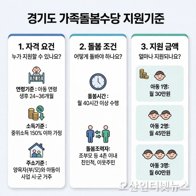 【오산인터넷뉴스】경기도 가족돌봄수당 사업 참여 시군이 지난해 14개에서 올해 26개 시군으로 늘어남에 따라 더 많은 도민들이 돌봄사업 혜택을 받게 됐다.