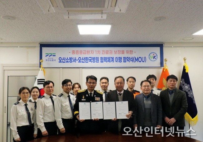 【오산인터넷뉴스】오산한국병원은 지난 6일 오산소방서와 중증 응급환자의 1차 진료권 보장을 위한 업무협약(MOU)을 체결하고, 응급실 미수용 문제 해소와 신속한 환자 치료를 위한 지역 응급의료 협력 체계 구축에 나선다고 밝혔다.