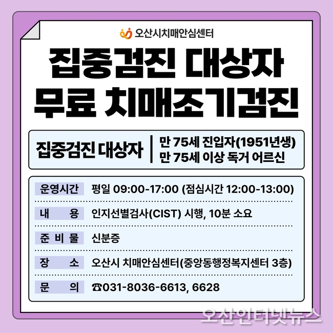 【오산인터넷뉴스】오산시치매안심센터는 치매의 조기 발견과 예방적 관리를 위해 관내 만 75세 진입자(1951년생) 및 만 75세 이상 독거 어르신을 대상으로 치매 집중검진을 실시한다고 밝혔다.