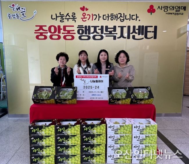【오산인터넷뉴스】오산시 중앙동 행정복지센터는 지난 10일, ㈜인슈프라자 오산지점 공혜란 지점장이 지역 내 취약계층 지원을 위해 샤인머스캣 2kg 30박스(약 150만 원 상당)를 기탁했다고 밝혔다.