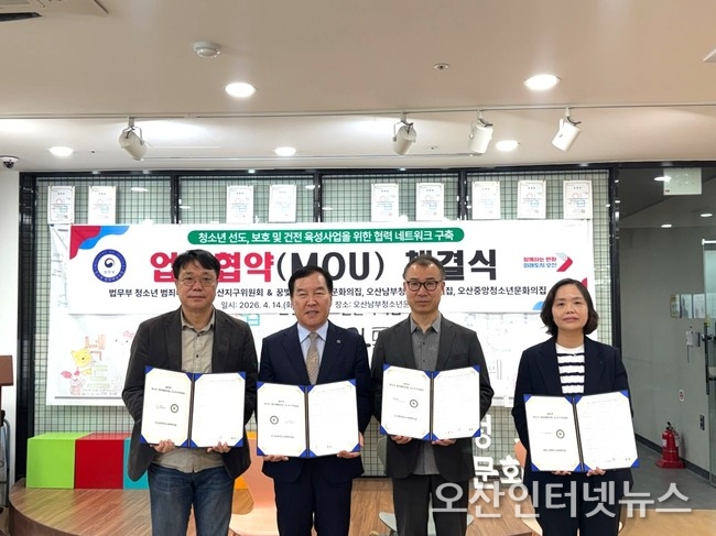 【오산인터넷뉴스】법무부 청소년범죄예방위원 오산지구위원회(회장 황선명)는 지난 14일 오산남부청소년문화의집에서 오산남부청소년문화의집, 꿈빛나래청소년문화의집, 오산중앙청소년문화의집과 청소년 협력사업 추진을 위한 업무협약(MOU)을 체결했다고 밝혔다.