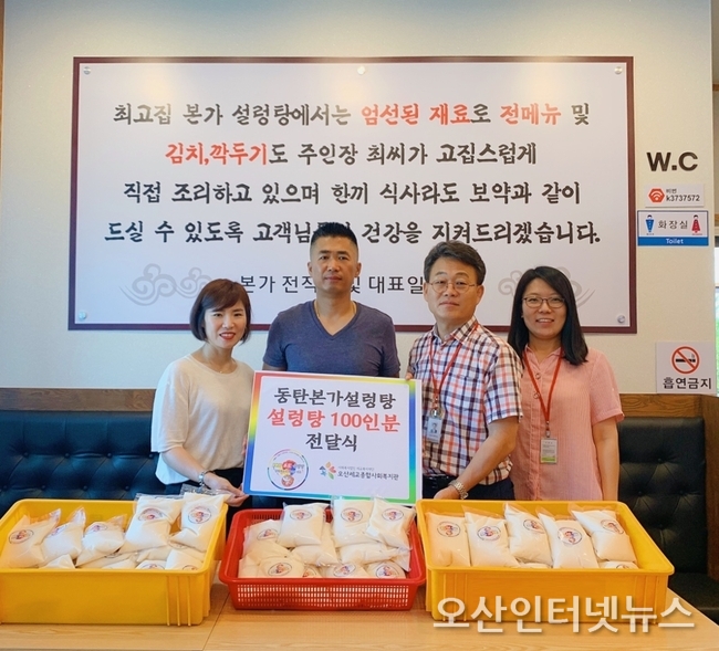 저소득 가정에게 설렁탕 100인분 전달 【오산인터넷뉴스】오산세교종합사회복지관은 8월 9일 동탄본가설렁탕의 지원을 받아 폭염으로 지친 저소득 가정에게 설렁탕 100인분을 전달하였다.
