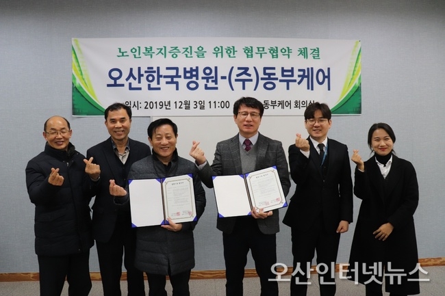 【오산인터넷뉴스】오산한국병원과 사회적기업 (주)동부케어는 12월 3일 동부케어 회의실에서 오산과 화성 등 지역사회 내 노인복지증진을 위한 업무협약을 체결하였다.