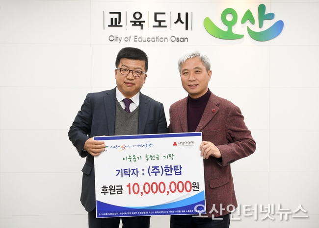 【오산인터넷뉴스】오산시는 지난 18일 ㈜한탑과 오산시청에서 저소득층 이웃돕기 성금 1,000만 원 기탁식을 가졌다.