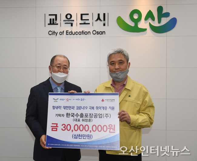 【오산인터넷뉴스】오산시누읍동 소재 한국수출포장공업주식회사는 13일 관내 취약계층을 위해 써 달라고 성금 3,000만원을 기탁했다.