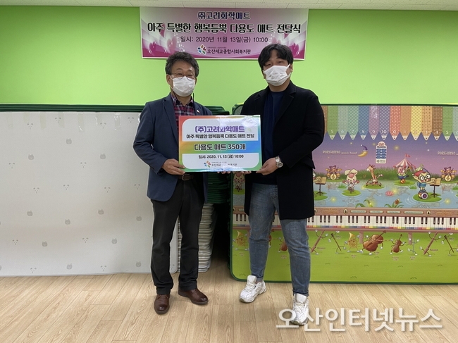 【오산인터넷뉴스】㈜고려화학매트는 지역 내 도움이 필요한 이웃들에게 나눔을 실천하기 위해 지난 11월 13일 오산세교종합사회복지관을 방문해 ‘아주 특별한 행복듬뿍 다용도 매트’350개를(1,500만원 상당) 후원했다.