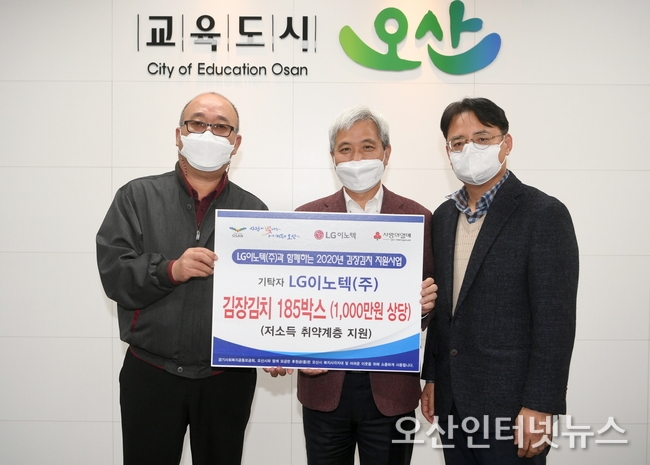 【오산인터넷뉴스】오산시는 지난 11월 26일 LG이노텍(주)에서 시청을 방문해 관내 저소득 가구를 대상으로 김장김치 185박스를 기탁했다고 밝혔다.