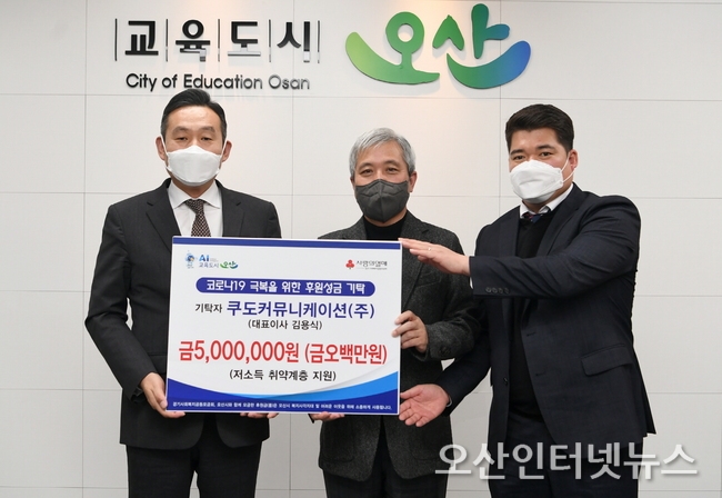 【오산인터넷뉴스】오산시는 4일 쿠도커뮤니케이션(주)(대표이사 김용식)에서 코로나19 장기화로 인해 생활이 어려운 저소득 취약계층을 위해 성금 5백만 원을 기탁했다고 밝혔다.