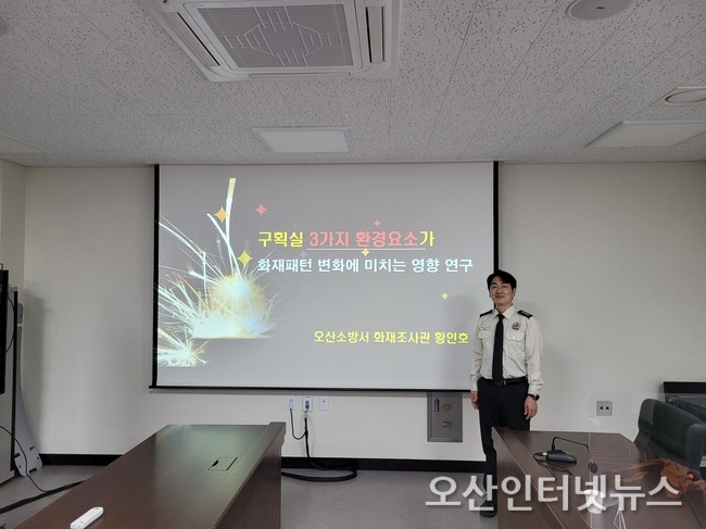 【오산인터넷뉴스】오산소방서가 경기도 화재조사 학술논문 발표대회에서 3년 연속 입상하는 쾌거를 이뤘다. 이번 2021년 경기도 화재조사 학술논문 발표대회에서 소방장 황인호는 『구획실 3가지 환경요소가 화재패턴 변화에 미치는 영향 연구』의 논문 주제로 ‘장려상’을 수상했다고 31일 전했다.