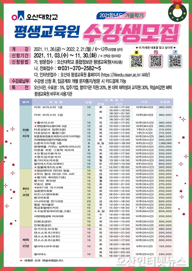 【오산인터넷뉴스】오산대학교 평생교육원에서는 겨울학기 평생학습 프로그램의 수강생을 모집 중이다. 11월 말부터 2월까지 6~12주 과정(과정별상이)으로 운영되는 이번 겨울학기 프로그램에서는 새롭고 다양한 강좌들이 운영될 예정이다.