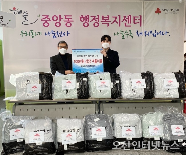 정원한의원은 또 23일 오산시 중앙동(동장 신선교)에도 관내 저소득 어르신들을 위해 100만 원 상당의 겨울이불 35채를 기탁했다. 기탁받은 겨울이불 35채는 경기사회복지공동모금회를 통해 중앙동 관내 저소득층 등 취약계층을 대상으로 전달될 예정이다.
