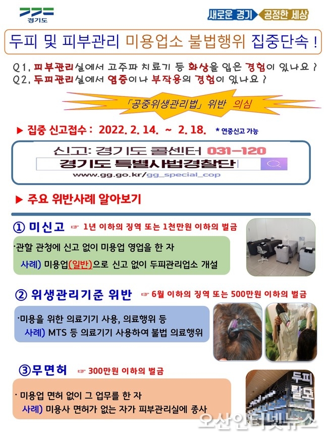 【오산인터넷뉴스】경기도 특별사법경찰단이 최근 탈모환자 증가에 따른 두피․탈모 관리서비스 시장 확대에 따라 2월 14일부터 18일까지 수원, 화성, 용인, 오산, 고양, 파주 6개 지역에서 규모가 큰 가맹점 위주로 두피 및 피부관리 미용업소 90개소를 대상으로 미신고‧무면허 등 불법행위를 집중 수사한다.