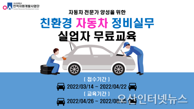 【오산인터넷뉴스】오산대학교 HRD사업단은 자동차정비 분야 전문 기능인을 양성해 수입차, 국산차 정비 사업소 등 다양한 기관에 취업이 가능한 <친환경 자동차 정비 실무 양성과정> 훈련생을 모집한다고 밝혔다.