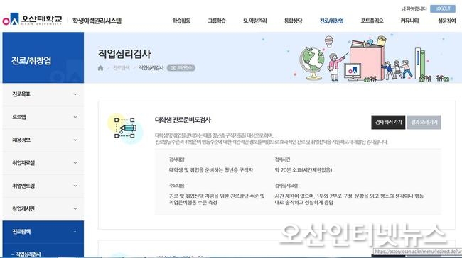 교내 학생이력관리시스템 ‘OStory!’에 접속하는 학생들은 교내외 비교과활동과 통합상담을 원스톱으로 이용할 수 있으며, 워크넷 오픈 API까지 연계하여 실시간으로 워크넷 직업심리검사(대학생 진로준비도검사, 직업선호도검사 등) 를 실시하고 결과를 확인할 수 있게 되었다.