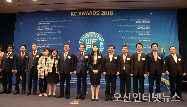 [제1회 대한민국 공헌대상 시상식] 2018년 7월 9일 오후 2시 국회헌정기념관 대강당에서 개최된 '대한민국 공헌대상' 시상식에서 세계연맹 이산하 총재와 수상자들이 기념촬영하고 있다(좌로부터: 세계연맹 상임고문 이치수 (사)대한인터넷신문협회 회장, 왕유월 중국양은대학교 부총장, 세계연맹 상임고문 문주현 MDM그룹 회장, 김정옥 주막보리밥 회장, 조선혜 지오영그룹 회장, 문인식 바바그룹 회장, 임영진 대한병원협회 회장, 세계연맹 이산하 총재, 더불어민주당 서형수 국회의원, 류경기 중랑구청장, 김영종 종로구청장, 이래철 (사)한국재난정보학회 회장, 전상직 한국주민자치중앙회 회장) (사진=세계언론협회 사진공동취재단)