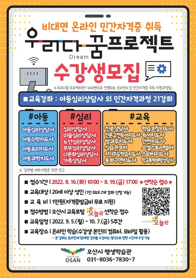 【오산인터넷뉴스】오산시는 20세 이상 성인을 대상으로 비대면 민간자격증 취득 프로젝트 ‘우리다꿈’수강생을 모집 중이라고 밝혔다.