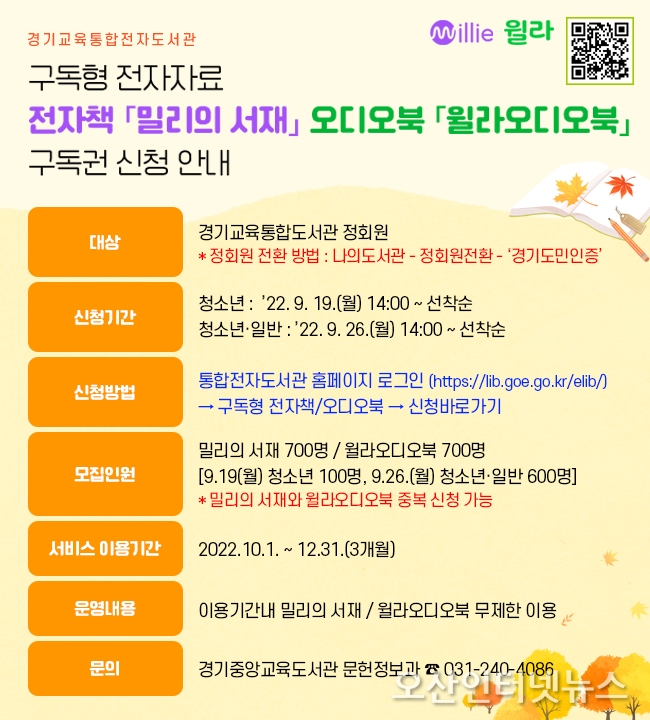【오산인터넷뉴스】경기중앙교육도서관이 경기교육통합전자도서관 정회원을 대상으로 ‘구독형 전자책과 오디오북 서비스’를 제공한다.