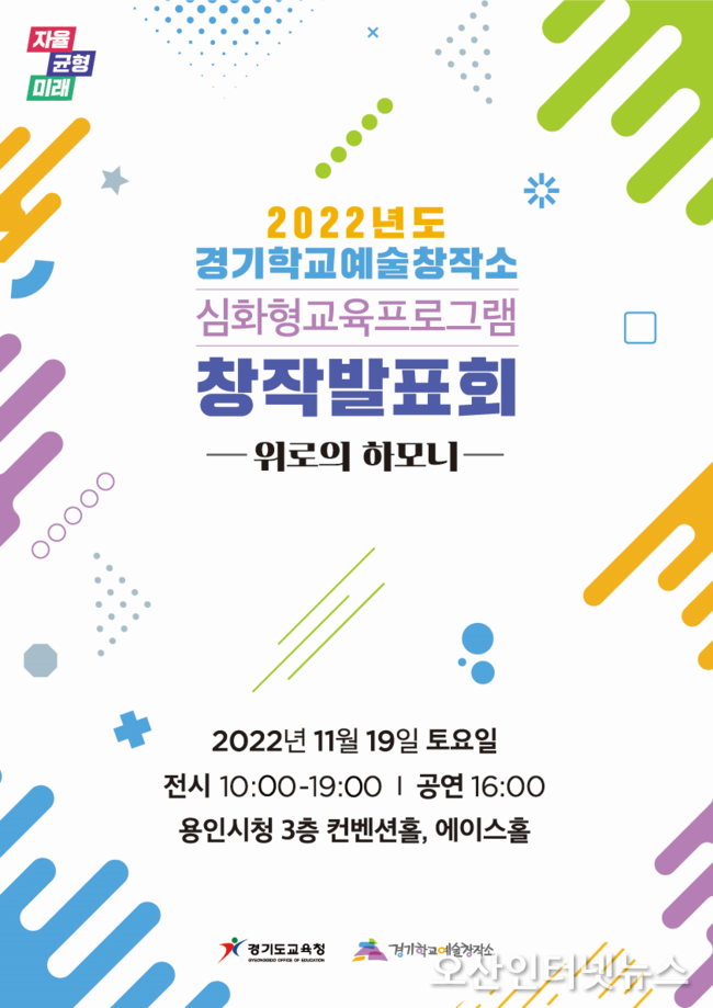 【오산인터넷뉴스】경기도교육청은 오는 19일 용인시청 컨벤션홀과 에이스홀에서 경기학교예술창작소 창작발표회 ‘위로의 하모니’ 전시와 공연을 한다.
