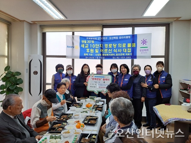 【오산인터넷뉴스】오산백합로타리클럽과 참조은애의료기가 지난 25일 신장동 세교 10단지 경로당에 어르신들의 건강관리를 위해 의료용 침대, 다리 마사지기, 적외선 치료기 등 의료기기와 경로당 어르신들을 위한 식사 등 300만 원 상당 물품을 기탁했다.
