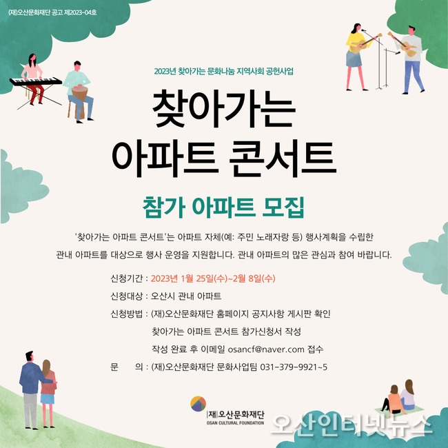 재단 관계자는 “민선 8기 이권재 오산시장의 시민이 주인이 되는 찾아가는 문화공연 확대 추진을 위해 찾아가는 아파트 콘서트를 기획했으며관내 아파트의 많은 관심과 참여를 바란다”고 했다.