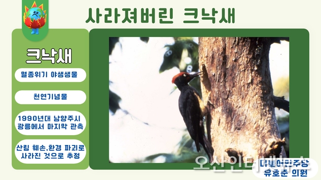 【오산인터넷뉴스】경기도의회 유호준 의원이 14일(화)에 진행된 경기도의회 제367회 임시회 1차 본회의에서 5분 자유발언에 앞서 크낙새의 사진을 표출해 남양주의 시조(市鳥)인 크낙새가 21세기 들어 더 이상 발견되지 않고 사라진 현실을 언급하며 산림훼손 환경파괴의 현실을 지적하며 사과했다.