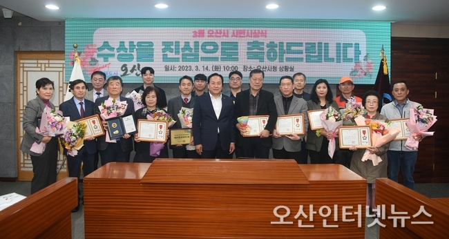 【오산인터넷뉴스】오산시는 지난 14일 지역사회를 위해 봉사하고 헌신한 유공자에게 감사한 마음을 전달하는 3월 시민시상식을 시청 상황실에서 개최했다고 밝혔다.