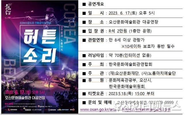 【오산인터넷뉴스】(재)오산문화재단은 앞서 한국문화예술회관연합회 지원 사업인 「2023 문예회관과 함께하는 방방곡곡 문화공감 사업-우수공연프로그램」 선정된 사실을 알린 바 있다. 선정된 4개의 우수한 공연 중 ‘허튼소리(Corea Beats)’ 공연을 시작으로 관객들을 맞이할 예정이다.