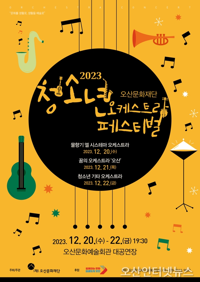 【오산인터넷뉴스】(재)오산문화재단(대표이사 이수영)은 오는 12월20일(수) ~ 22일(금)까지 3일간 오산문화예술회관 대공연장에서 ”2023 오산 청소년 오케스트라 페스티벌“을 개최한다고 밝혔다.