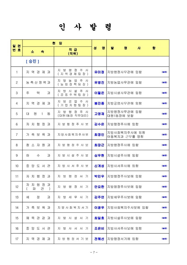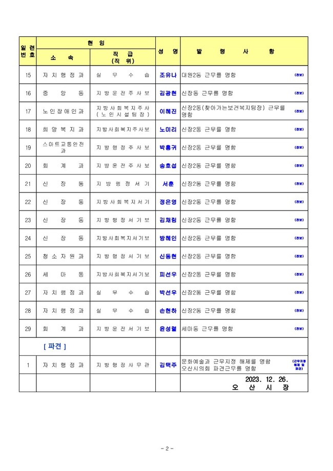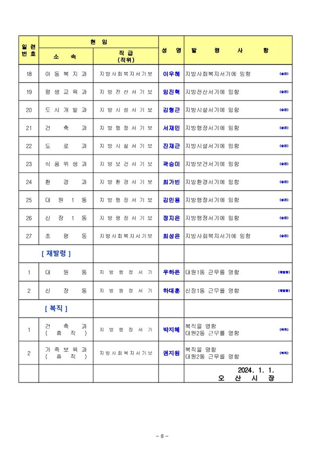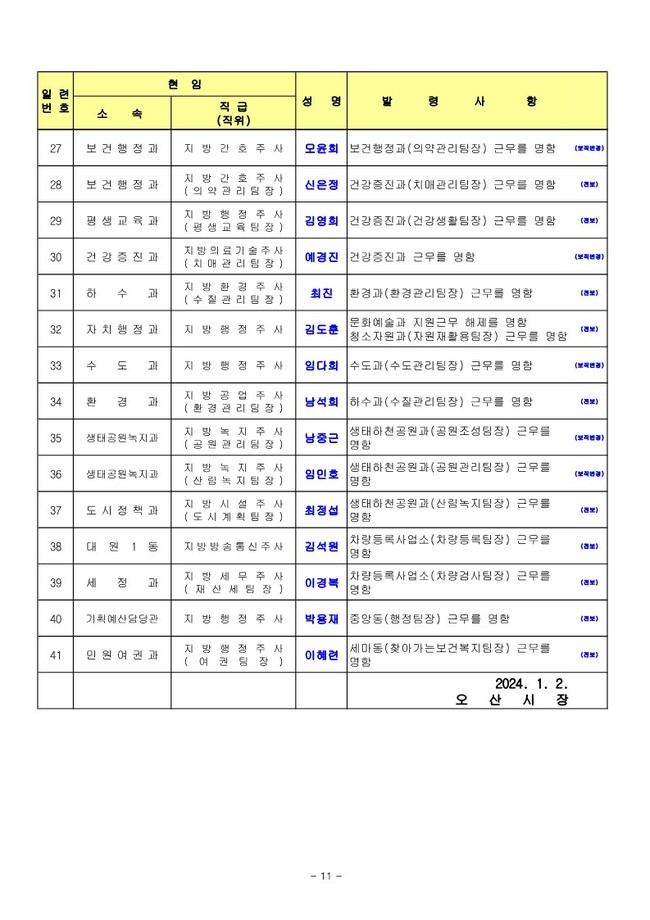 【오산인터넷뉴스】오산시가 2024. 1. 1일자 인사발령을 발표했다.