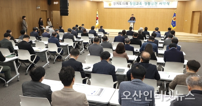 【오산인터넷뉴스】경기도의회(의장 염종현)가 18일 의회 대회의실에서 의회사무처 5급 이상 공무원을 대상으로 ‘청렴교육 및 청렴실천 서약식’을 실시했다.