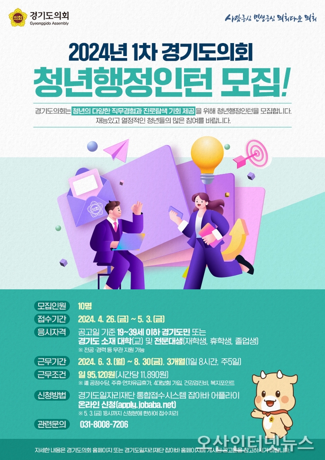 【오산인터넷뉴스】경기도의회는 청년들에게 다양한 직무경험과 진로탐색 기회를 제공하고 취업 및 역량강화를 통한 청년 실업문제 해소에 일조하기 위해 청년행정인턴을 모집한다.