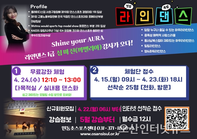 라인댄스 샘플링 수업은 무료강좌로 진행되며, 체험단 모집은 선착순 25명으로 안내데스크 방문 또는 전화접수로 진행하고 있으며, 신규회원 모집은 22일(월) 06시부터 오산시시설관리공단 스포츠통합사이트를 통해 진행된다.