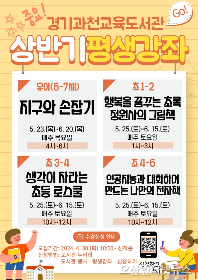 【오산인터넷뉴스】경기과천교육도서관(관장 조정수)이 30일부터 ‘상반기 평생학습 프로그램’ 수강생 60여 명을 선착순 모집한다.