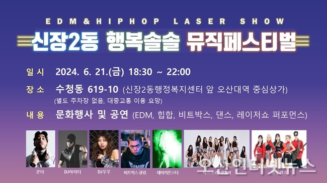【오산인터넷뉴스】오산시 신장2동은 분동에 따른 동 청사 개소를 축하하고 동민의 화합과 골목상권을 활성화하고자 오는 21일 18시 오산대역 중심상가 거리에서 ‘제1회 신장2동 행복솔솔 뮤직 페스티벌’을 개최한다.