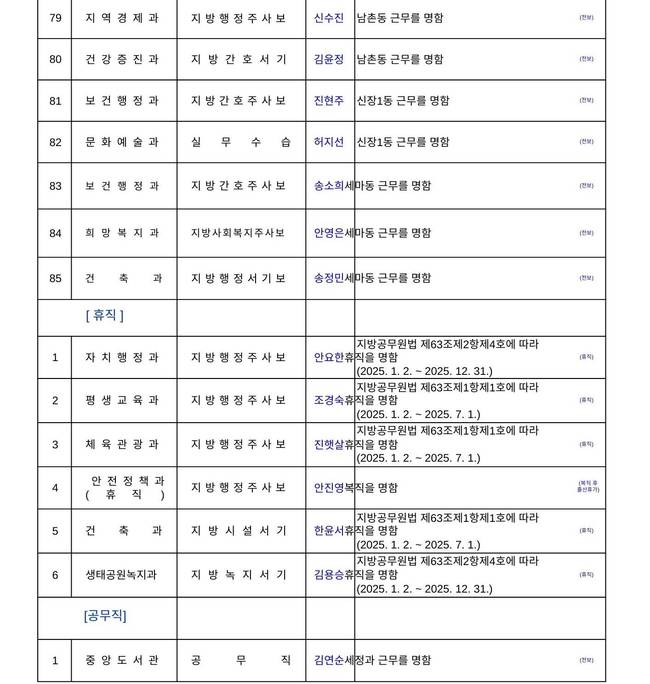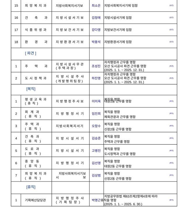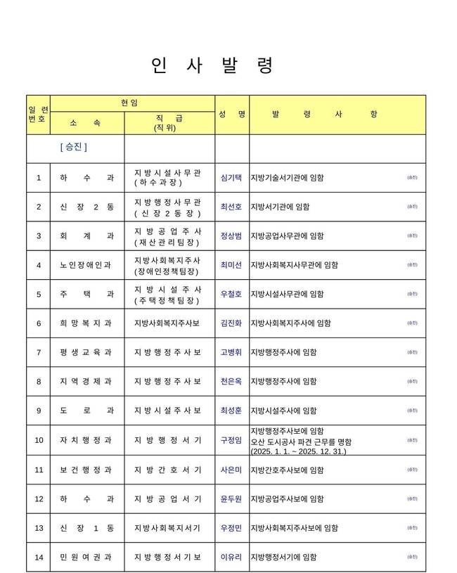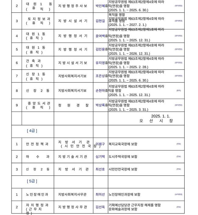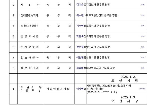【오산인터넷뉴스】오산시가 2025. 1. 2일자 인사발령을 발표했다.