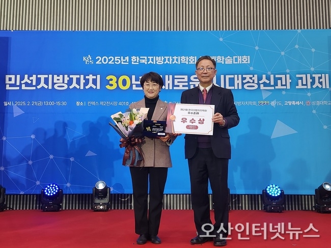 【오산인터넷뉴스】경기도의회 경제노동위원회 고은정 위원장(더불어민주당, 고양10)은 21일(금) 킨텍스 제2전시장에서 열린 ‘제21회 한국지방자치학회 우수조례 시상식’에서 개인부문 우수상을 수상했다.
