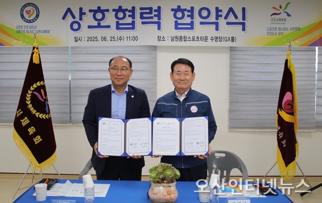 【오산인터넷뉴스】오산시체육회(회장 권병규)는 지난 6월 25일(화), 남원시체육회(회장 류흥성)와 체육 분야 상호 교류 및 협력을 위한 업무협약(MOU)*을 체결했다고 밝혔다.