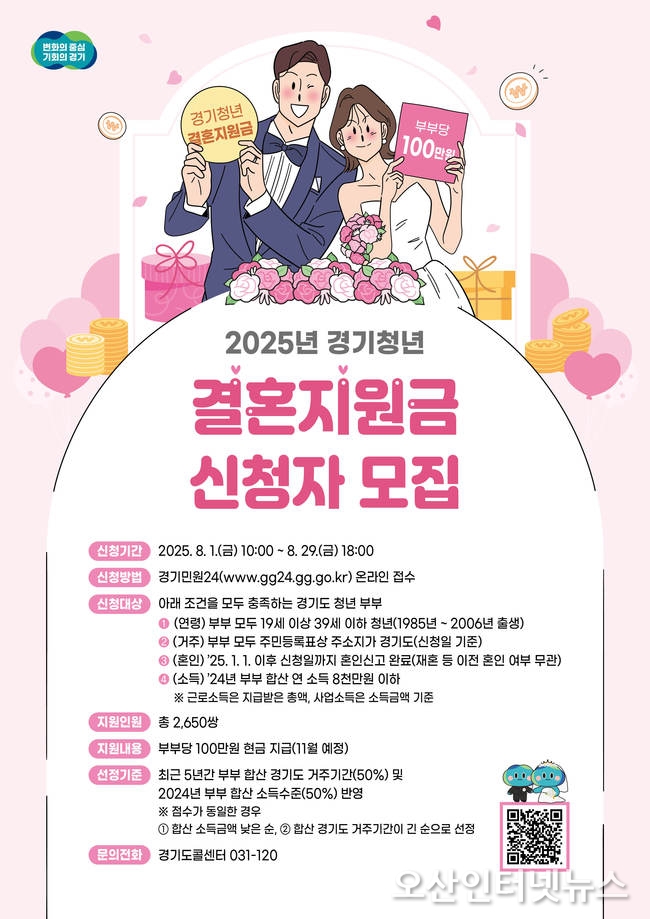 【오산인터넷뉴스】경기도는 오는 8월 1일부터 29일까지 청년 신혼부부의 경제적 부담을 덜고 생활 안정을 돕기 위한 ‘2025년 경기청년 결혼지원사업’ 신청자를 모집한다.