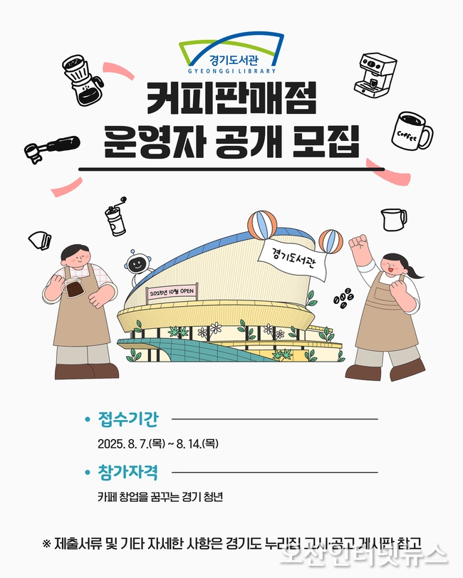 【오산인터넷뉴스】경기도가 오는 10월 개관을 앞둔 경기도서관 내 커피 판매점의 운영자를 모집한다. 대상은 카페 창업을 꿈꾸는 경기 청년이며, 신청 기간은 8월 7일부터 14일까지다.
