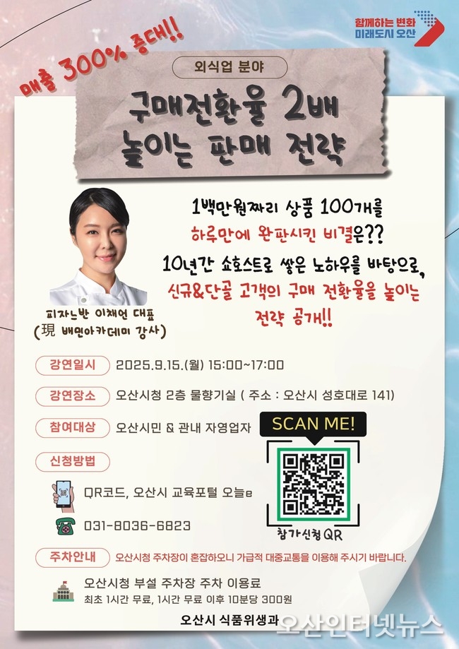 【오산인터넷뉴스】오산시는 오는 9월 15일 오산시청 2층 물향기실에서 자영업자와 창업 예정 시민 등 80명을 대상으로 「외식업 활성화를 위한 구매전환율 2배 높이는 판매 전략」 강연을 개최한다고 밝혔다.